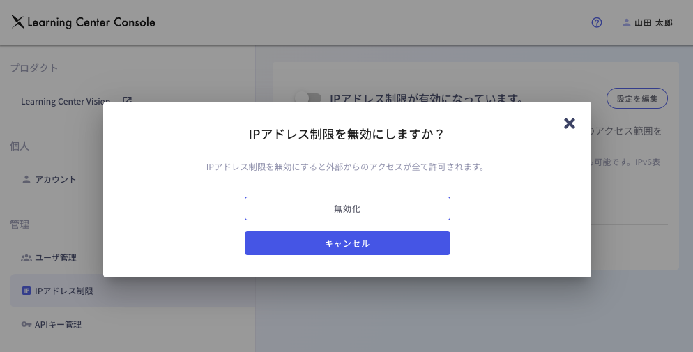「IPアドレス制限がが有効になっています。」の左側にあるトグルスイッチをクリックすると、「IPアドレス制限を無効にしますか?」というダイアログが表示されます。