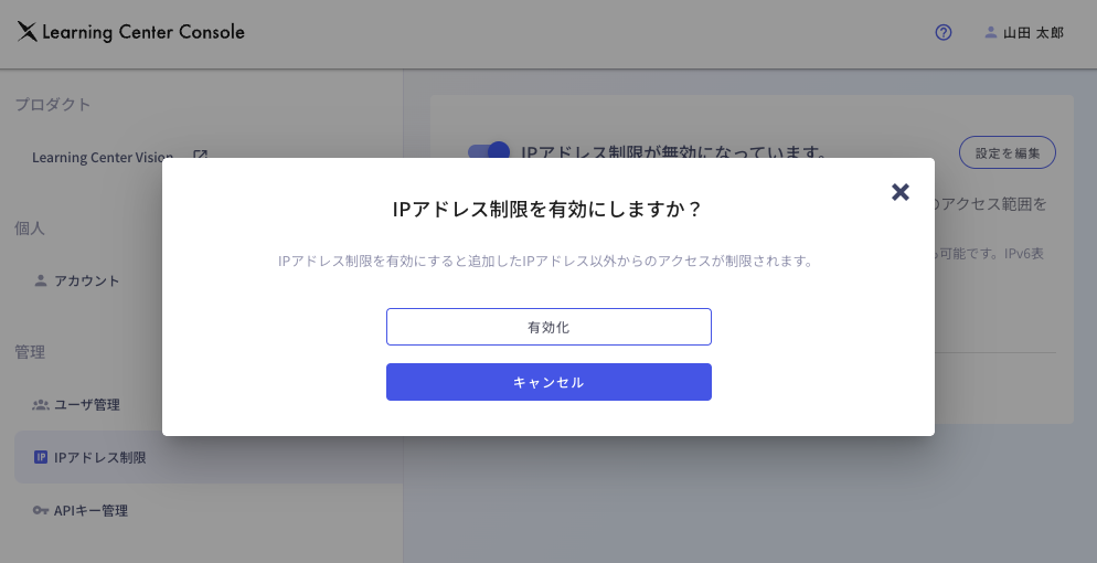 IPアドレスが1個以上登録された状態で、「IPアドレス制限がが無効になっています。」の左側にあるトグルスイッチをクリックすると、「IPアドレス制限を有効にしますか?」というダイアログが表示されます。