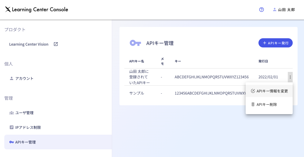 APIにアクセスするためのAPIキーを発行・削除し、APIキー名やメモなどのAPIキー情報を変更することができる画面です。