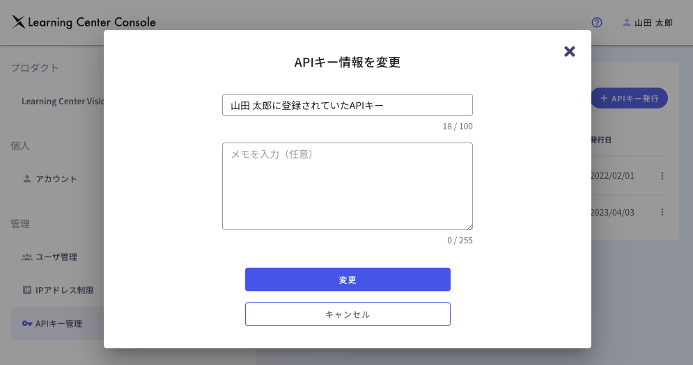 APIキー情報を変更ダイアログで、変更したいAPIキー名やメモを編集し、「変更」ボタンをクリックすると反映されます。