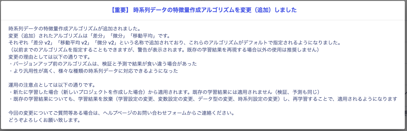 【重要】 時系列データの特徴量作成アルゴリズムを変更(追加)しました
