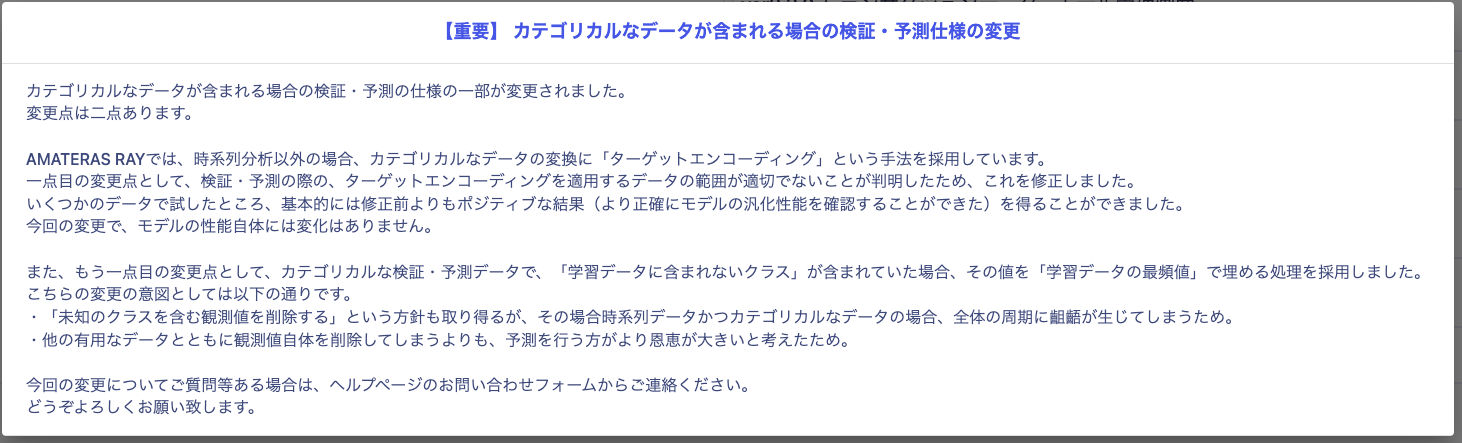 カテゴリカルなデータが含まれる場合の検証・予測の仕様の一部が変更されました。